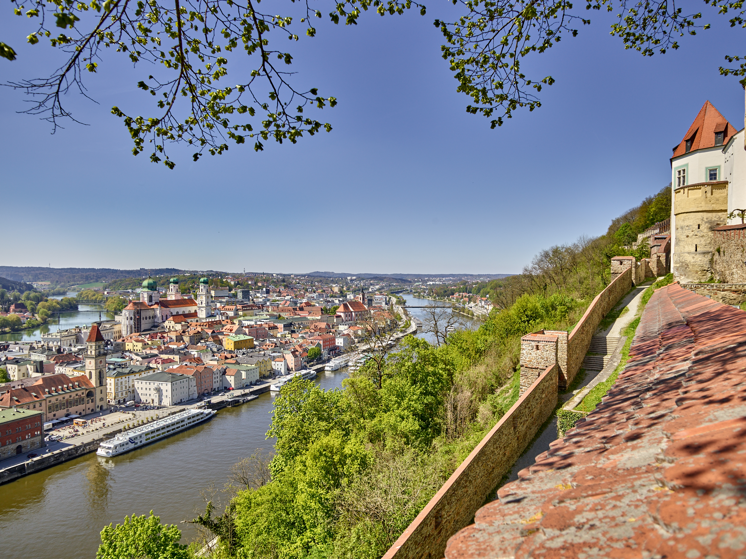 The Linde Battery, a former artillery platform surrounded by defensive walls at the eastern end of Veste Oberhaus, offers a unique view of the confluence of the rivers Danube, Inn and Ilz. The natural spectacle of the three differently-coloured rivers can be admired to full advantage from beneath the old lime (Linde) trees at the edge of the Battery. You can also see the spectacular panorama of Passau with St Stephen's Cathedral, Mariahilf Monastery, the Town Hall and the historical old town, all the way to Austria and the foothills of the Bavarian Forest.