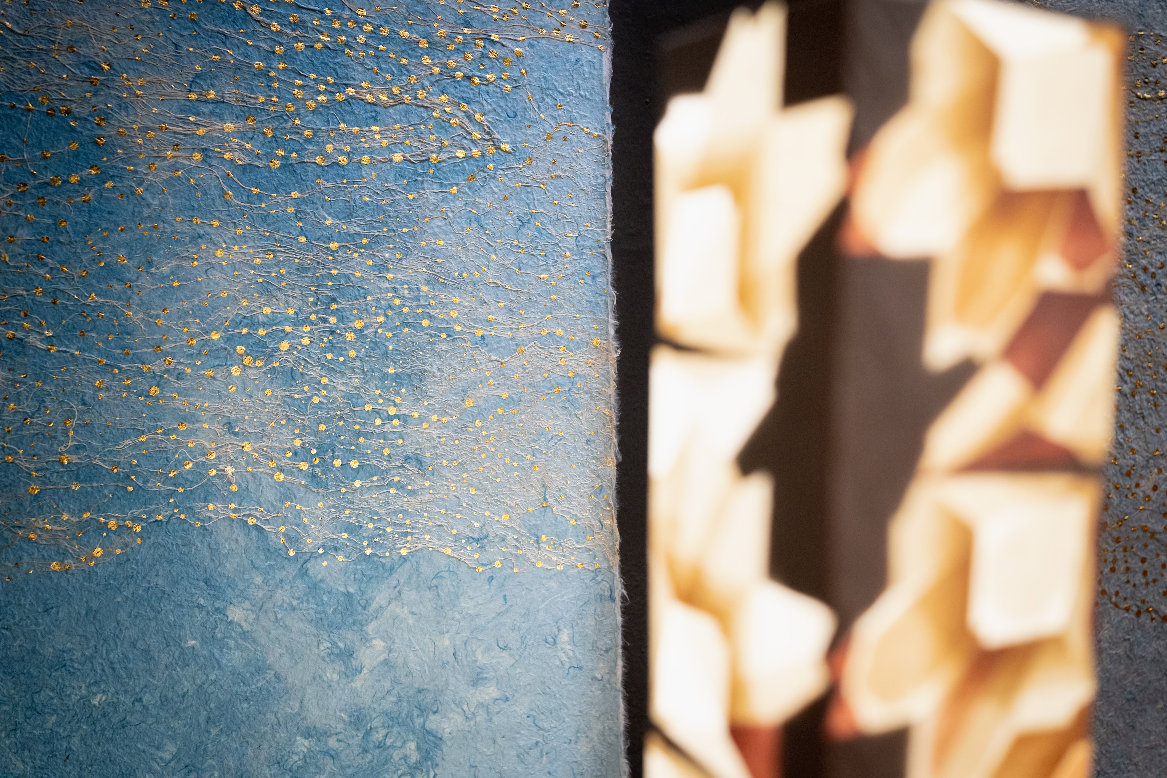 Im zweiten Teil der Ausstellung präsentieren Koji Shibazaki und Mikako Suzuki Lampen aus feinstem washi und Wandtapeten mit filigranen Mustern aus Blattgold. Durch das übereinander Kleben verschiedener washi Sorten entstehen skulpturale Objekte, die das Licht unterschiedlich brechen. Ein Spiel mit Schatten und Licht entsteht, das an das gedämpfte Licht japanischer Papierlaternen erinnert.