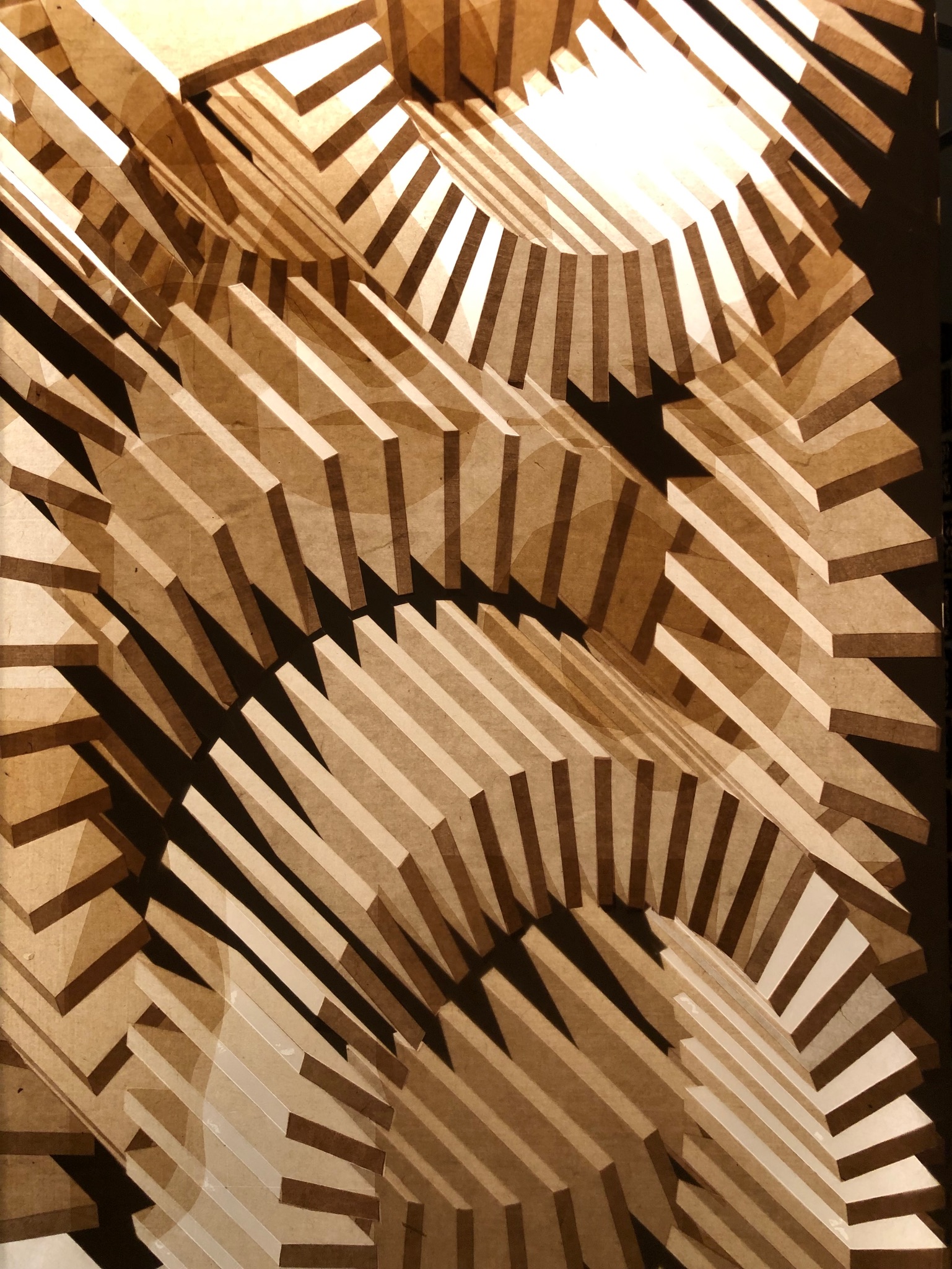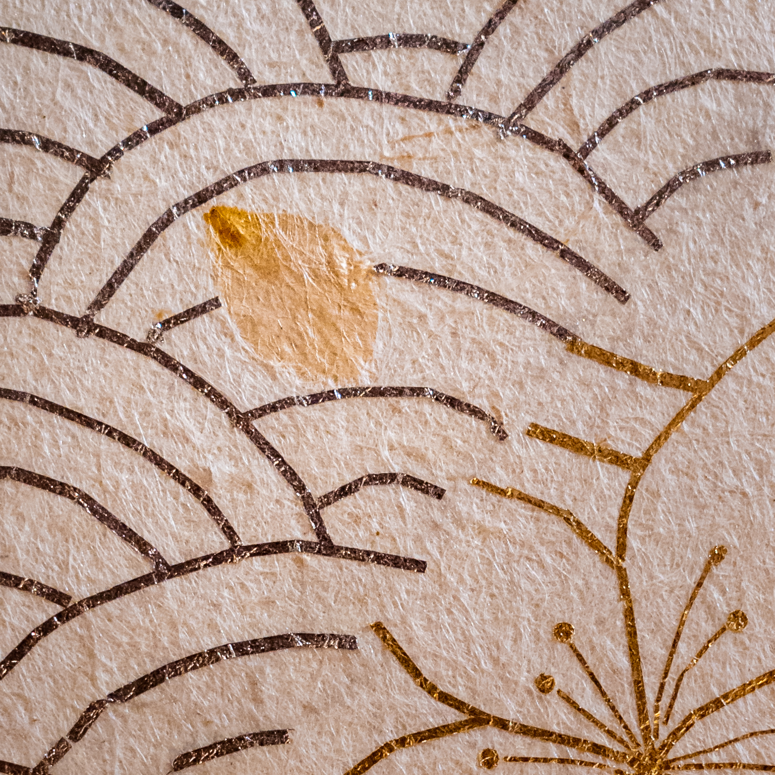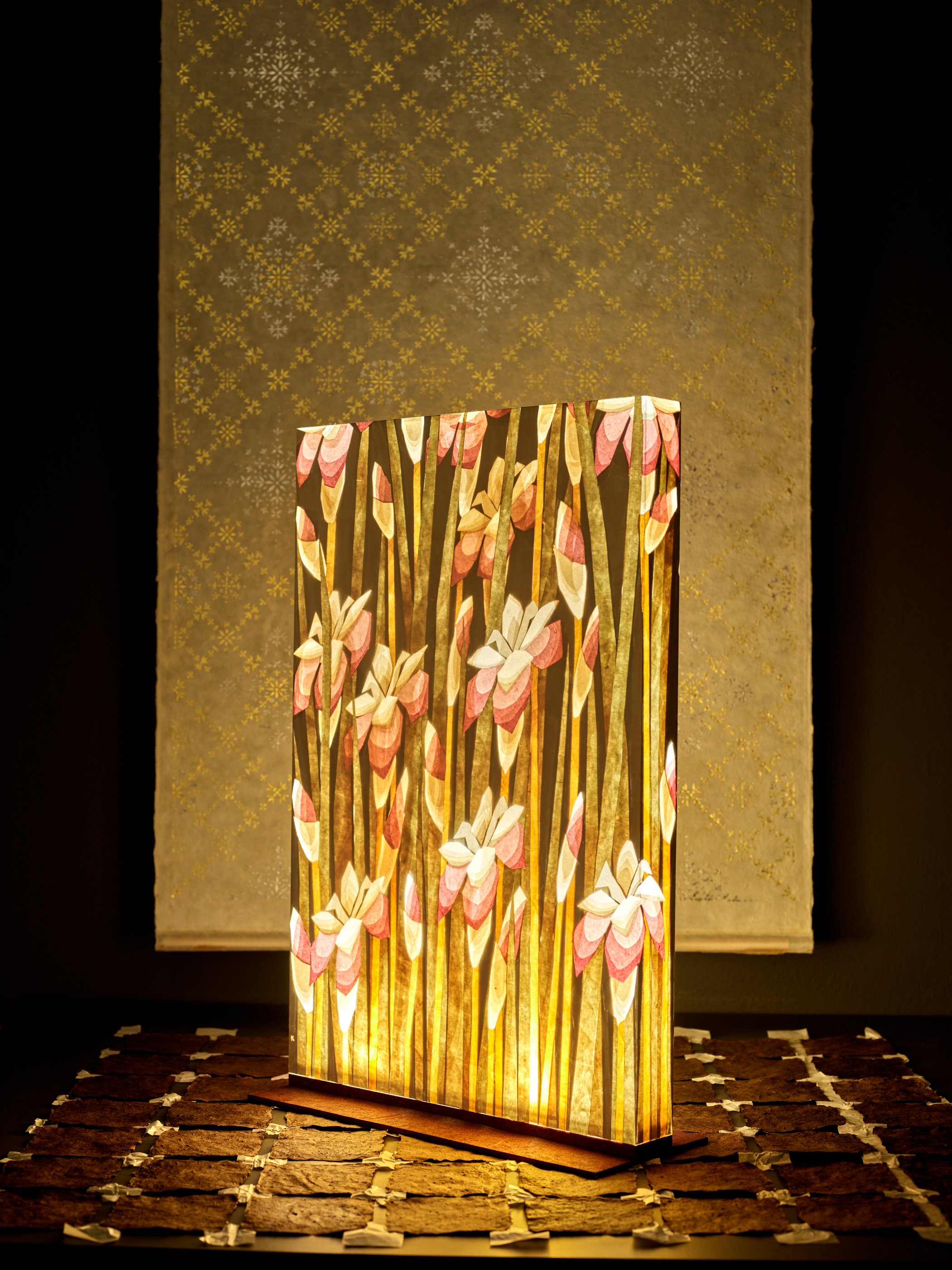 Im zweiten Teil der Ausstellung präsentieren Koji Shibazaki und Mikako Suzuki Lampen aus feinstem washi und Wandtapeten mit filigranen Mustern aus Blattgold. Durch das übereinander Kleben verschiedener washi Sorten entstehen skulpturale Objekte, die das Licht unterschiedlich brechen. Ein Spiel mit Schatten und Licht entsteht, das an das gedämpfte Licht japanischer Papierlaternen erinnert.